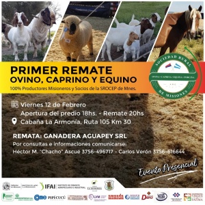 Con apoyo crediticio del Instituto de Fomento Agropecuario e Industrial (IFAI) y del Gobierno provincial, el viernes 12 de febrero se celebrará en el establecimiento de Cabaña La Armonía (sede de la Sociedad Rural Ovina, Caprina, Equina y Porcina de Misiones) el primer remate de animales menores misioneros, con más de 200 cabezas entre reproductores, vientres, majada general y animales de consumo.