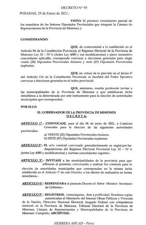 El gobernador Oscar Herrera Ahuad, convocó para el día 6 de junio de 2021 a los comicios generales para la elección de 20 diputados provinciales titulares y siete suplentes, con lo cual Misiones será la primera del país.