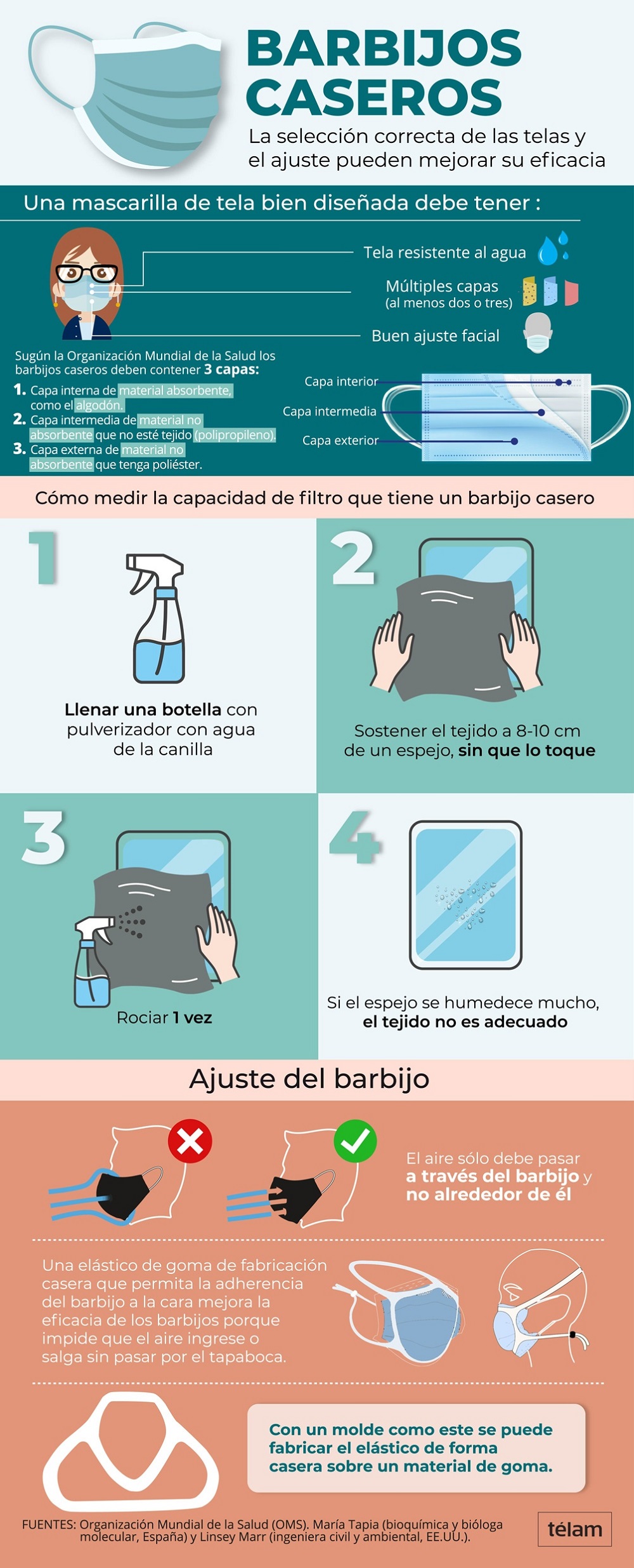 Desde hace más diez meses el uso del barbijo casero es parte de la vida cotidiana, sin embargo su confección sigue generando dudas y por eso los especialistas recomiendan hacerlos con dos o tres capas y un ajuste que permita que el aire ingrese siempre a través de la mascarilla para mejorar su eficacia.