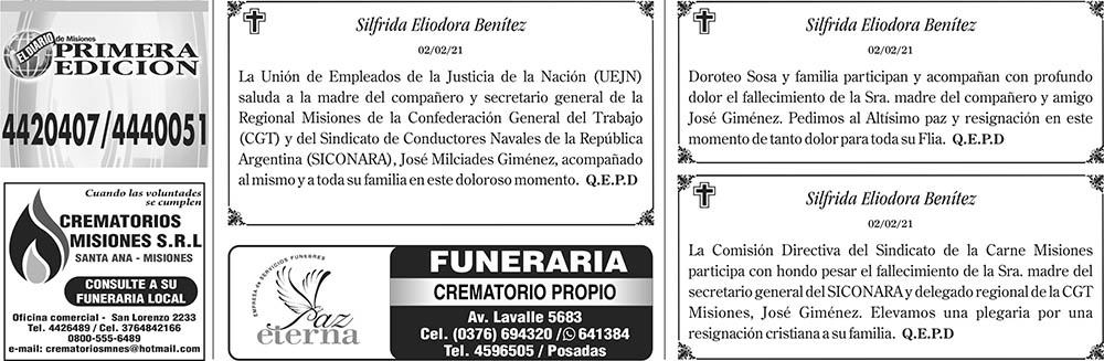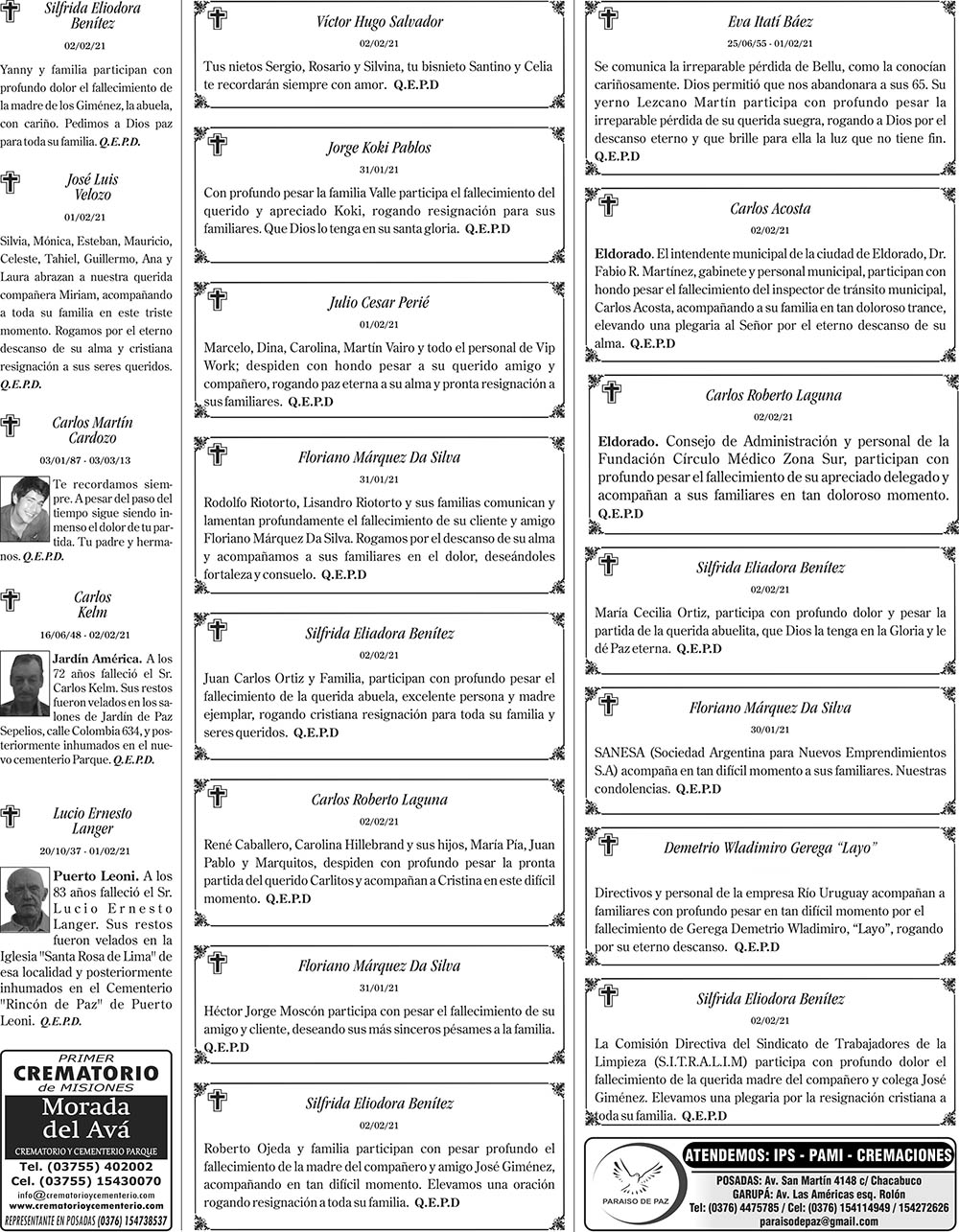 Fúnebres del Miércoles 3 de Febrero de 2021