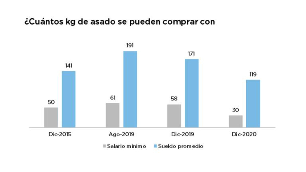 “El kilo de asado aumentó el 93% entre 2019 y 2020. El salario mínimo compra sólo la mitad que hace un año, medido en kilos. El salario promedio compra 30% menos, sólo en un año”, precisó.