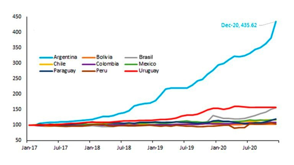 Luego, se ubicó México con el 0,8% en enero y 3,5 % en el último año (se prevé 3,6% en 2021; Chile registró el 0,7% y 3,1%, respectivamente y Perú 0,7% y 2,6%, mientras que para este año llegaría al 2,9 por ciento. Un peldaño más abajo se ubicó Paraguay con el 0,5% en enero y el 2,6% el último año, mientras que se prevé el 2,9% para 2021; en Colombia fue del 0,4%, con una suba del 1,4% en 12 meses y una proyección del 2,8% para este año. En Brasil fue del 0,25% el mes pasado y del 4,5% en 12 meses (en 2021 se espera 3,6%) y en Ecuador fue del 0,1%, con una caída del -1,04% en 12 meses y una proyección de -1,01% para este año.