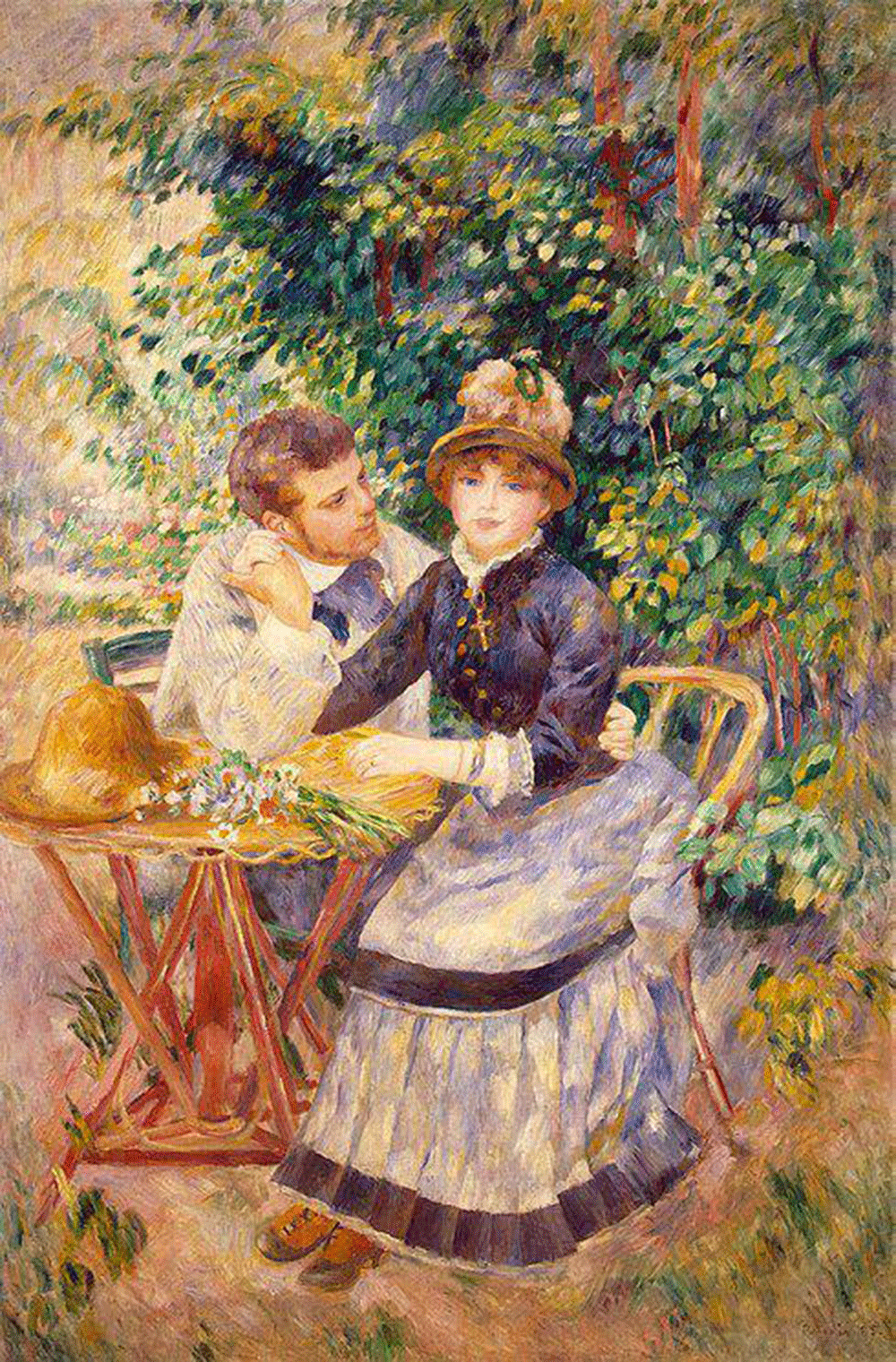 A diferencia de los prerrafaelitas, que eran capaces de contar una película entera en una imagen, los pintores impresionistas tendían a rehuir esas escenas tan “declamativas” y cargadas de significado. Pese a dicha preferencia por una mayor ligereza, aquí Renoir nos mostró a una joven pareja disfrutando de un día campestre. Ella menos que su novio que permanece tan absorto contemplándola que no sabe si es de día o de noche. Los protagonistas son Aline Charigot, la novia en ese momento del artista y futura esposa, y un amigo de este, Henry Laurent. Ambos fueron retratados también en este dibujo de Renoir.