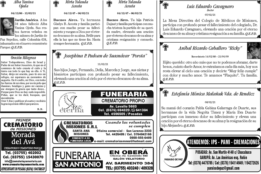 Fúnebres del Domingo 14 de Febrero de 2021