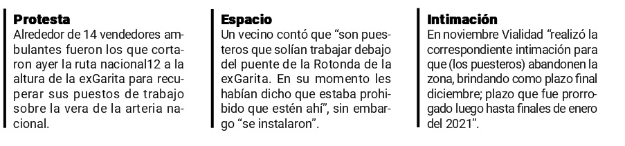 Este miércoles un grupo de vendedores ambulantes de los puestos ubicados sobre la ruta 12, a la altura de la exGarita, llevaron adelante una protesta luego de haber sido desalojados por Vialidad Nacional. Los manifestantes quieren recuperar sus puestos de trabajo.