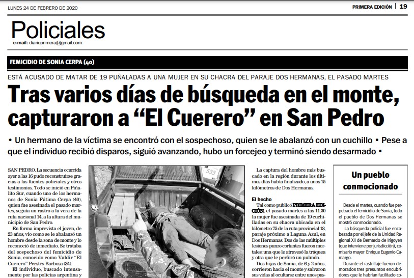 Cerca del mediodía del martes 18 de febrero de 2020, en una chacra ubicada en el kilómetro 75 de la ruta provincial 18, el salvaje crimen de Sonia Cerpa (40) conmovió a todo el país.