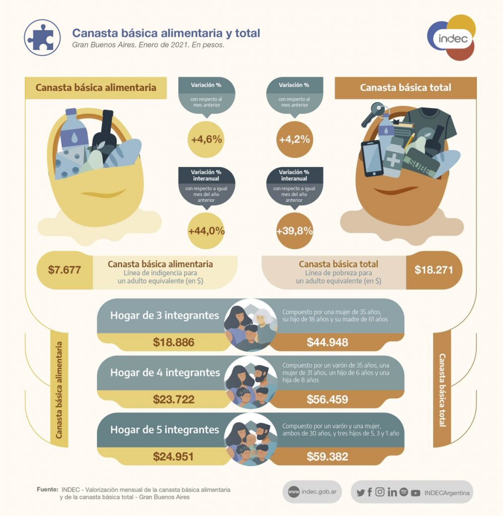 De esta forma, la CBT tuvo una variación de 39,8% respecto a igual mes del año anterior, mientras que la CBA registró un aumento de 44%, una diferencia que se explica porque las tarifas de servicios públicos y de transporte están prácticamente congeladas desde principios de 2020, mientras los precios del rubro de alimentos fueros de los que más subieron en los últimos meses.