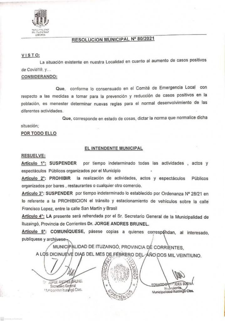 Tras el repunte de casos en la ciudad correntina de Ituzaingó, el intendente de la ciudad Eduardo Burna firmó la resolución 80/21 que decreta suspensiones y prohibiciones de actividades, ya sea en el ámbito público o privado.