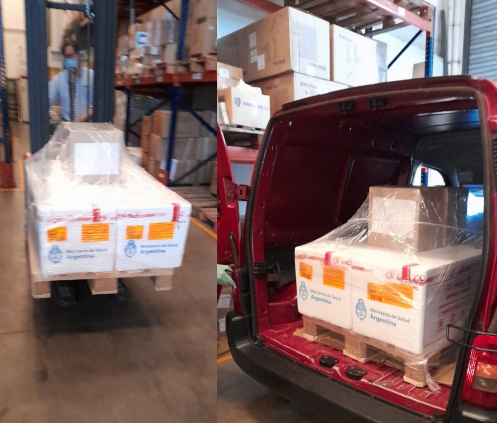 El operativo de traslado y almacenaje se desarrolla en el Centro de Logística de Central Argentino, previo a su distribución en los centros de vacunación en la provincia.