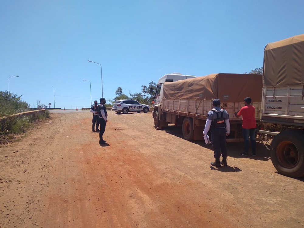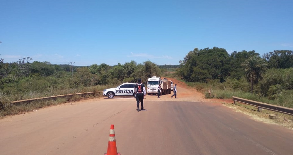 Eran las 12:30 cuando efectivos de la Dirección General de Seguridad Vial y Turismo; de la Agrupación Motorizada y de la comisaría 15ª frenaron el ingreso al By Pass de un Scania 320 y un Ford Cargo, cada uno con aproximadamente 40 mil kilos de soja.