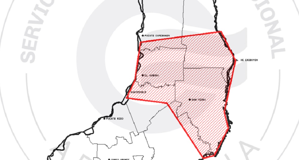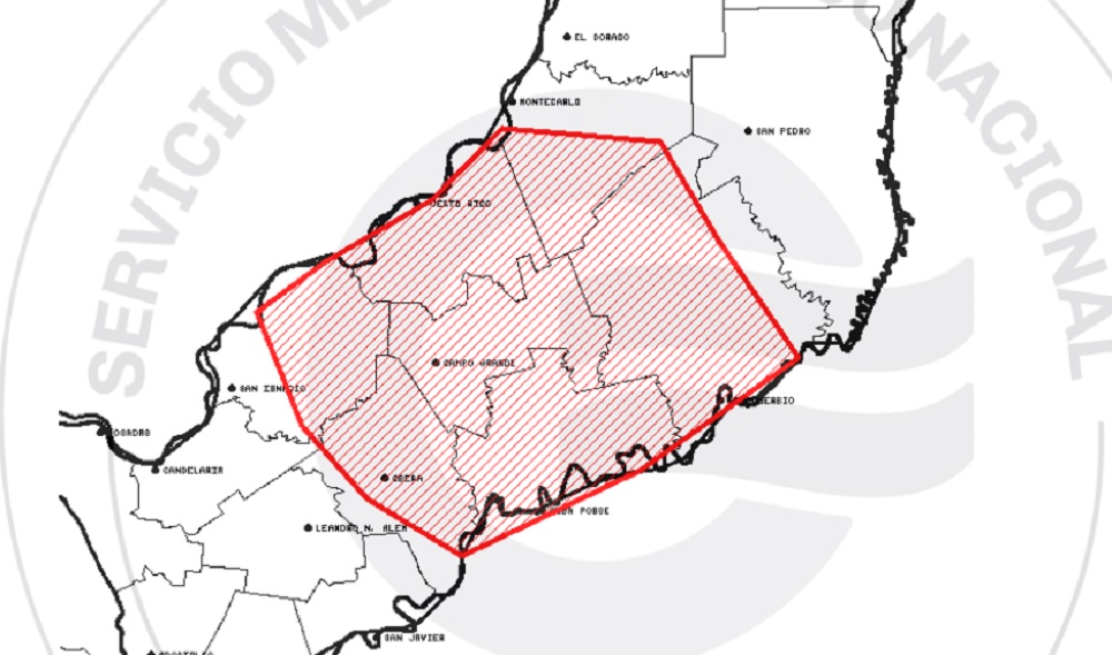 La advertencia tiene vigencia al menos hasta las 19 y abarca los departamentos 25 de Mayo, Cainguás, Guaraní, Oberá, Libertador San Martín, Montecarlo y San Ignacio.
