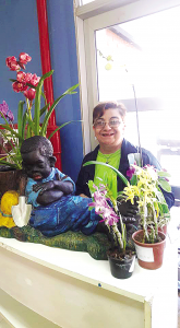También creó un jardín aéreo para aprovechar el espacio, y esto es lo que nos contó: “La idea del jardín aéreo fueron las ansias de tener un espacio para mis orquídeas, como vivo en un primer piso no podía porque era muy pequeño. Entonces empecé a pensar cómo hacer y anduve viendo cómo. Se me ocurrió usar malla cima y hierros, los mandé a hacer en el aire, en un espacio donde no molesta a nadie y la gente pasa por abajo”, así logró un hermoso espacio. Colocó diferentes plantas verdes como helechos, calagualas, cactus y bromelias; y por supuesto orquídeas nativas. Pero no terminó ahí, tiene además “una fuente no muy grande con plantas acuáticas”.