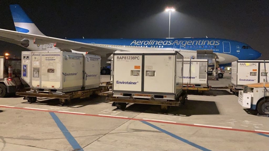 Las 904.000 dosis arribaron a bordo de un avión equipado con envirotainers, que son contenedores especiales con control activo de temperatura que permiten trasladar un mayor volumen de vacunas en la bodega del avión.