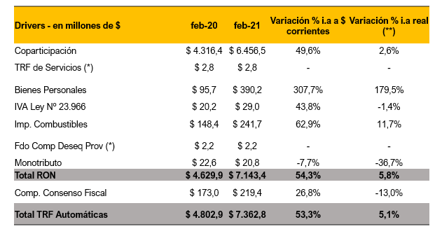 Las transferencias automáticas del Estado nacional a las provincias volvieron a tener crecimientos reales en febrero y continúa así su racha alcista: en este mes, se distribuyó un total de $230.704,6 millones, registrando un crecimiento interanual del 48,1% a pesos corrientes, que ajustados por alza de precios equivale a un incremento real del 5,8%, mayor al registrado en enero que fue de 3,7%. De este modo, las transferencias automáticas ya llevan siete meses consecutivos de alzas reales en la Argentina.