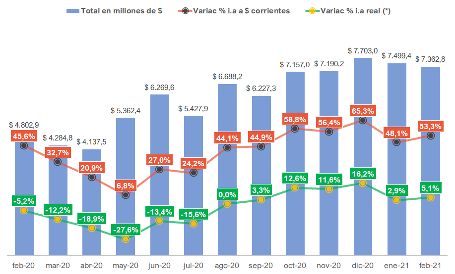 En febrero, todas las provincias mostraron incrementos reales, pero de distintas magnitudes, y al igual que lo detallado en el informe correspondiente al mes anterior (enero 2021) esa situación se explica en parte por los impactos inflaciones de acuerdo a las regiones: las provincias patagónicas tuvieron las mayores alzas reales a raíz de un menor aumento del IPC para dicha región; mientras que en las provincias del NEA mostraron los menores incrementos por tener mayor suba del IPC regional.