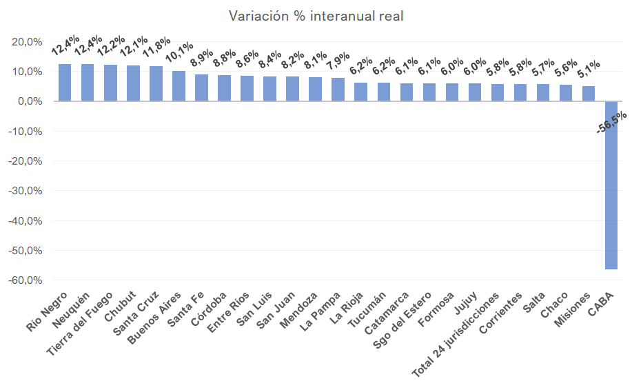 En ese marco, Río Negro, Neuquén, Tierra del Fuego, Chubut y Santa Cruz tuvieron incrementos reales por encima del 11%, y la provincia de Buenos Aires se mete en el lote de provincias con aumentos de dos dígitos (+10,1%)