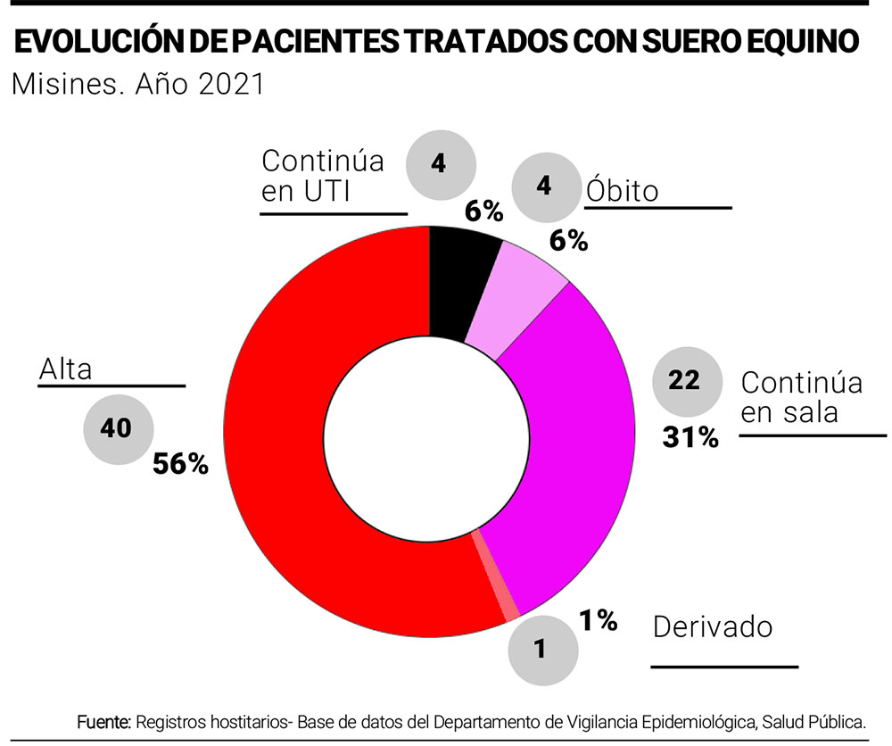 En cuanto a la evolución de los 71 misioneros tratados con suero equino, el 56% ya recibió el alta médico, el 31% continúa internado en sala común, el 6% permanece internado en UTI, otro 6% falleció y el 1% fue derivado a un centro de mayor complejidad.