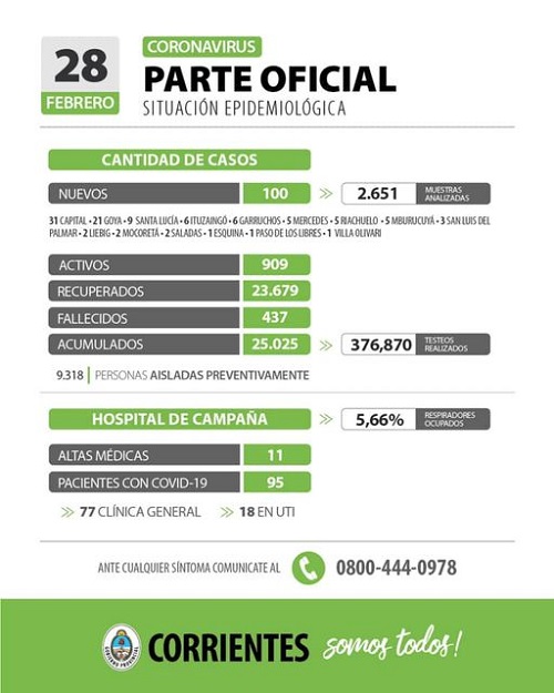 Esto actualiza la cifra de casos activos en 909 y los acumulados en 25.025 en todo el territorio provincial al 28 de febrero de 2021, con 376.870 testeos realizados desde que inició la pandemia y 23.679 recuperados.