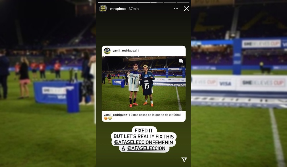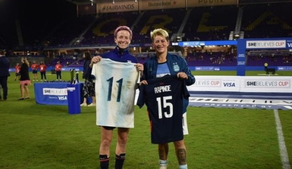 La jugadora estadounidense publicó un mensaje en el que se ve una foto de ella junto a la misionera Yamila Rodríguez, futbolista de Boca, con quien intercambió camisetas. En la imagen se ve el nombre de Rodríguez porque lo escribió Rapinoe.