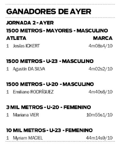 Y así fue. Por ejemplo, en la prueba de 1.500 metros reservada para la categoría U-23, el obereño Agustín Da Silva, todo un referente del atletismo misionero, conquistó una marca de 4m02s2/10.