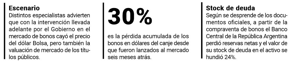 Además del desplome de la valuación de los títulos públicos y el ascenso del riesgo país a niveles no vistos desde la reestructuración soberana cinco meses y medio atrás, la intervención oficial en la plaza de renta fija también tiene un elevado costo sobre las golpeadas reservas netas del Banco Central.