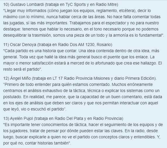 Entre los especialistas, desde Misiones, fue contactado Angel Miño, periodista deportivo del diario PRIMERA EDICIÓN y comentarista en LT 17 Radio Provincia de Misiones, quien dio su concepto. “Primero de todo entender para quién estamos comentado. Muchos erróneamente centramos el análisis exhaustivo de la táctica, técnica o explicar los sistemas como un postulado. En realidad, me parece, que la capacidad de un buen comentario, está dada en los ejes de análisis que deben ser claros y que nos permitan interactuar con aquel que leyó, vio o escuchó el partido”, explicó Miño.