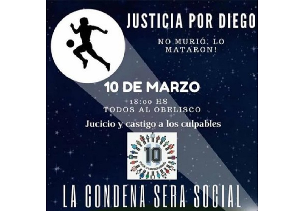 “Justicia x Diego. No murió, Lo Mataron!”, dice uno de los afiches que ya circula por las redes sociales y convoca a los maradonianos, quienes exigen “juicio y castigo a los culpables #10MPORD10S”.