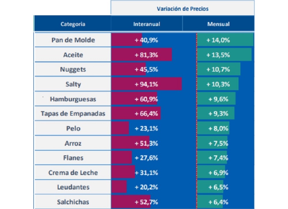 En cuanto a los productos cuyos precios lideraron los aumentos en la medición interanual, hay dos que más que duplican la inflación general estimada en los últimos doce meses: los snacks, con el 94,1%, y el aceite, con el 81,3%.