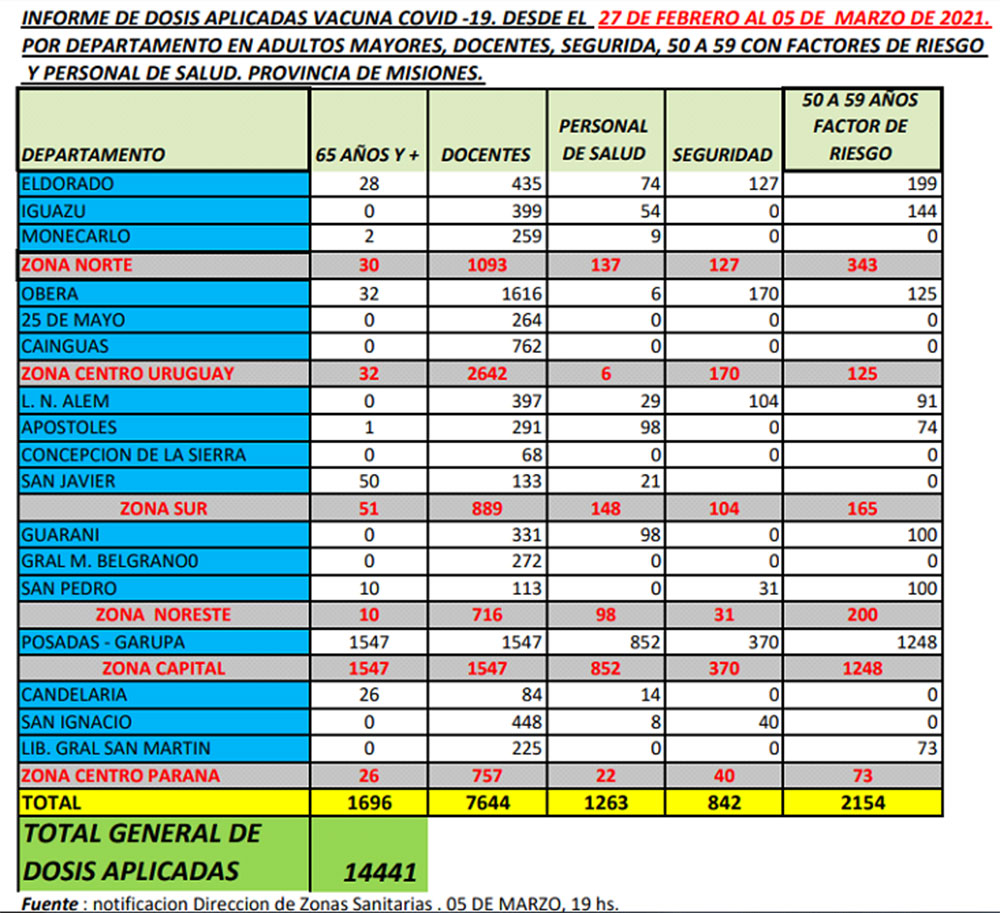 • Adultos mayores de 65 años: entre el 27 de febrero, día que comenzó a inmunizarse a este grupo etario, y hasta este viernes 5 recibieron sus primeras dosis 1.696 misioneros. Esta población es la que a partir de ahora podrá completar el esquema con la partida del componente dos que llegó este sábado a Misiones. También a partir de la próxima semana se retomará la inmunización con la inminente llegada de un cargamento del componente uno de la Sputnik V.