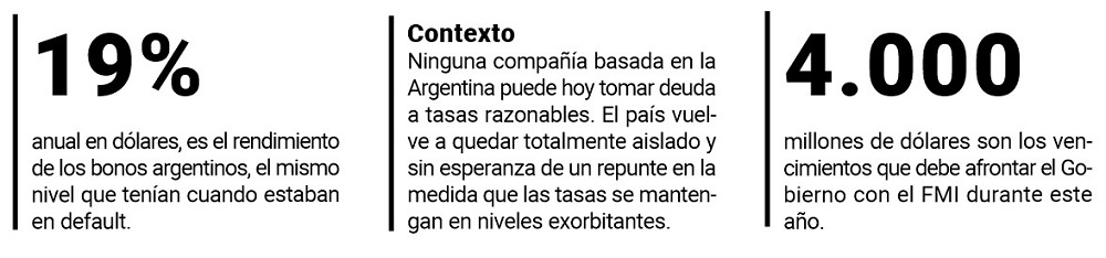 La deuda argentina volvió a niveles previos a la reestructuración, es decir cuando se encontraba en default. Y el rendimiento de los títulos ya se ubica en 19% anual en dólares, lo que convierte a la Argentina una vez más en campeón del mundo de riesgo país, que roza los 1.600 puntos.