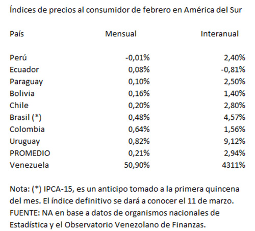 El OVF informó un aumento de precios minoristas del 50,9% para febrero y del 4.311% en los últimos doce meses, un desempeño alejado de la realidad de la región, en la que solamente la Argentina presenta una inflación interanual de dos dígitos.