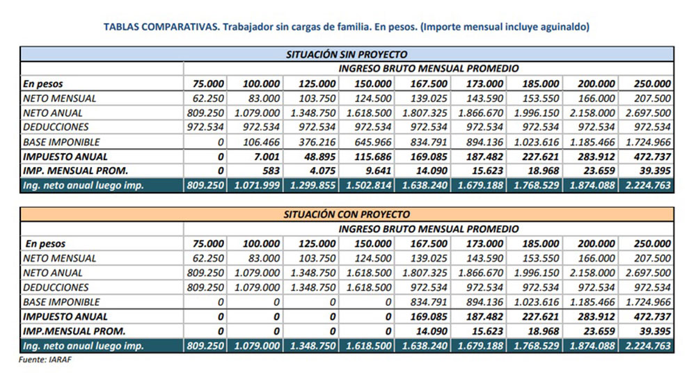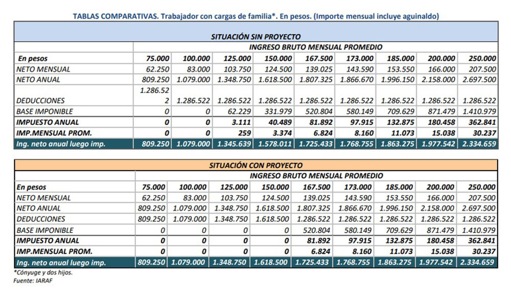 “La propuesta actual formula, en esencia, una suerte de deducción adicional solo aplicable a los trabajadores dependientes (y una solución equivalente para pasivos) cuya remuneración bruta mensual sea igual o inferior a $ 150.000, cuyo monto será el necesario para que no deban abonar el impuesto, considerando además en estos casos como no alcanzado el SAC (aguinaldo)”, explicó al respecto el IARAF.