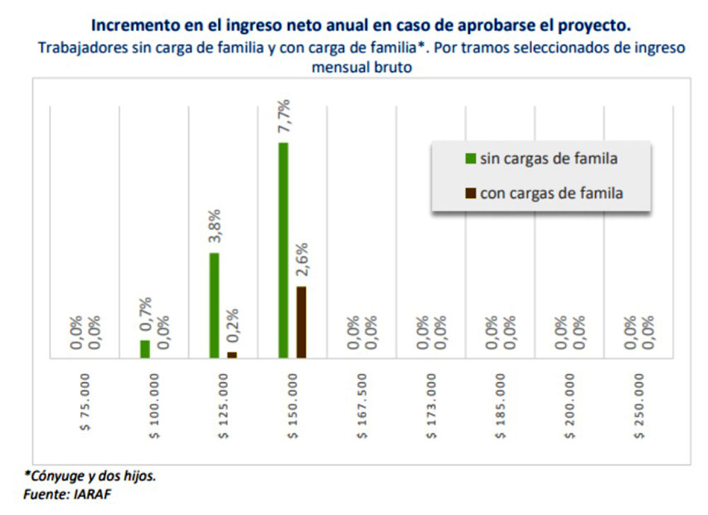 Los trabajadores con cargas familiares tendrán que percibir un salario bruto de $125.000 (neto $103.750) para notar una mejora nominal. En este caso, sería de $3.111 pesos anuales ($ 259,25 mensuales), equivalentes al 0,2%.