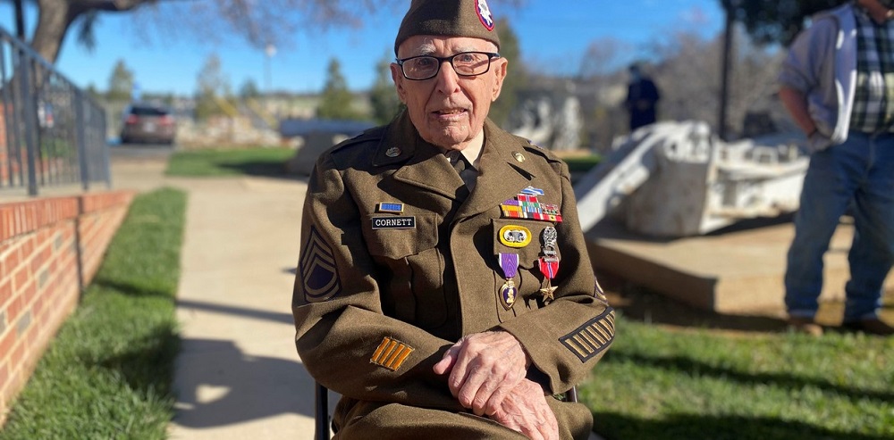 Casi 80 años después de resultar herido por un mortero alemán mientras peleaba en el Canal Mussolini en Italia, el sargento de primera del ejército estadounidense Marvin Cornett posó orgulloso en su impecable uniforme adornado esta vez con el Corazón Púrpura y la Estrella de Bronce.