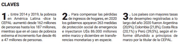 Si bien las medidas de proyección social evitaron un mayor aumento de la pobreza, las consecuencias económicas y sociales de la contingencia sanitaria serán significativas entre los países de la región.