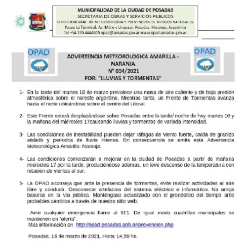 La Oficina de Prevención de Riesgos Ante Desastres Naturales (OPAD), dependiente de la Municipalidad de Posadas, emitió una advertencia “amarilla-naranja” ante la probabilidad de lluvias y tormentas en la capital misionera.