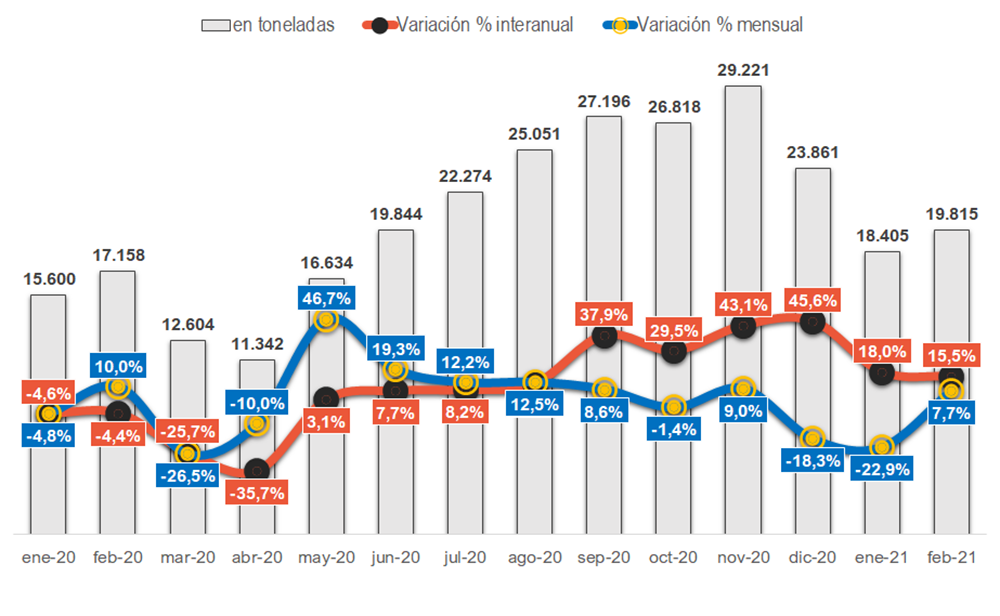 Pese a esta alza mensual, la provincia aún está bastante por debajo del techo que alcanzó en noviembre, cuando rozó las treinta mil toneladas consumidas, pero quedó más cerca de volver al nivel de las veinte mil toneladas, donde se ubicó entre julio y diciembre del año 2020.