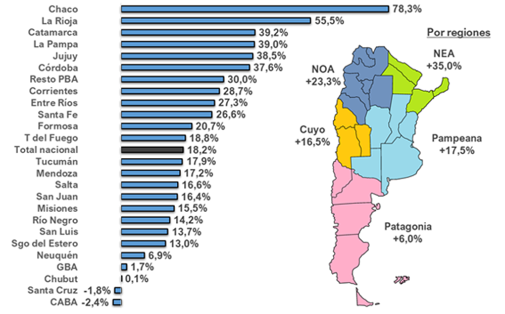 En la comparación regional, se debe destacar que el NEA es la que mostró los mejores resultados: el consolidado regional tuvo un incremento del 35%, liderando a nivel nacional; el NOA tuvo el segundo mayor aumento regional (+23,3%), seguida por la región Pampeana (+17,5%), Cuyo (+16,5%) y cierra la Patagonia con +6%.