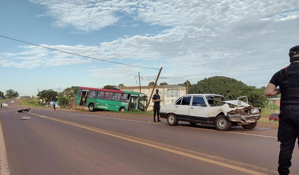 Ocurrió esta mañana en la ruta nacional 14, a la altura del kilómetro 876, donde por causas que se investigan colisionaron un colectivo urbano, guiado por un hombre de 51 años, quien circulaba sin pasajeros, un Peugeot 504, al mando de un hombre de 36 años, acompañado por otro de 21; y una motocicleta de 110 cc, conducida por una mujer de 26 años.