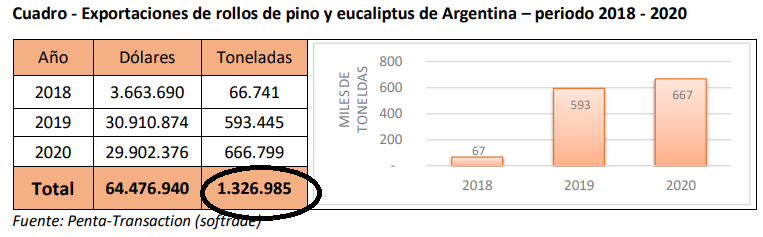 El funcionario aportó los datos del Instituto de Fomento Empresarial de Corrientes, donde se revela que lo exportado en 2020 alcanza 1.360.000 toneladas, sumando pino y eucalipto. Y lo comparó con un informe del Ministerio de Industria de Corrientes donde se observa que esa provincia cuenta con un potencial anual de 9 millones de toneladas disponibles. Quiere decir que lo exportado representa apenas el 15% de la madera disponible en aquella provincia.