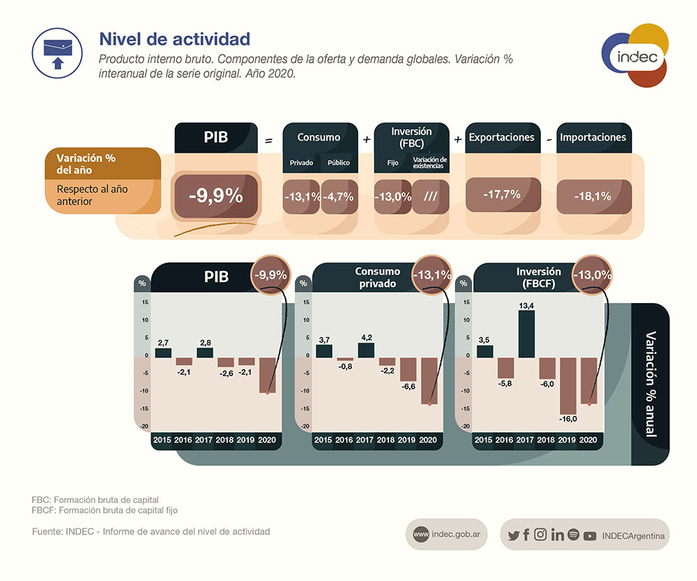 De esta forma, en 2020, el PIB mostró una baja de 9,9%, informó el organismo al divulgar el Informe de Avance de Nivel de Actividad, un indicador que es anticipado por el EMAE, que había arrojado en esta ocasión una caída del 10%.