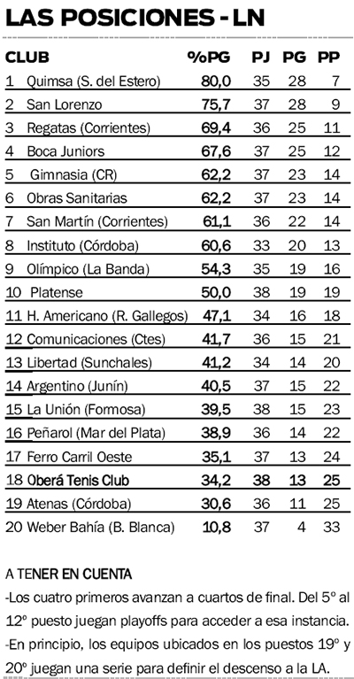 Luego del gran triunfo ante Instituto, el conjunto obereño dependía de otros resultados para esquivarle al repechaje ante Weber Bahía. Y el resultado que esperaba llegó, pues Atenas de Córdoba, que estaba obligado a ganar las dos presentaciones que le quedaban, cayó ante Libertad de Sunchales y de este modo quedó condenado al playout.