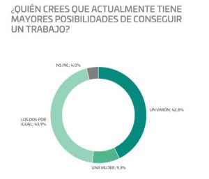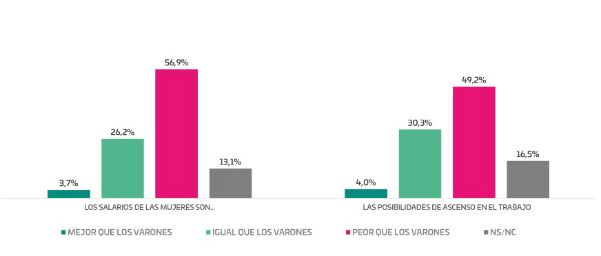 Los números son contundentes cuando la pregunta se refiere a los salarios. Casi un 57% asevera que sus sueldos son peores que los de los varones, un 49,2% asegura que la posibilidad de ascenso en el trabajo es peor y un 52,6% señala que las oportunidades para encontrar un empleo son más desfavorables.