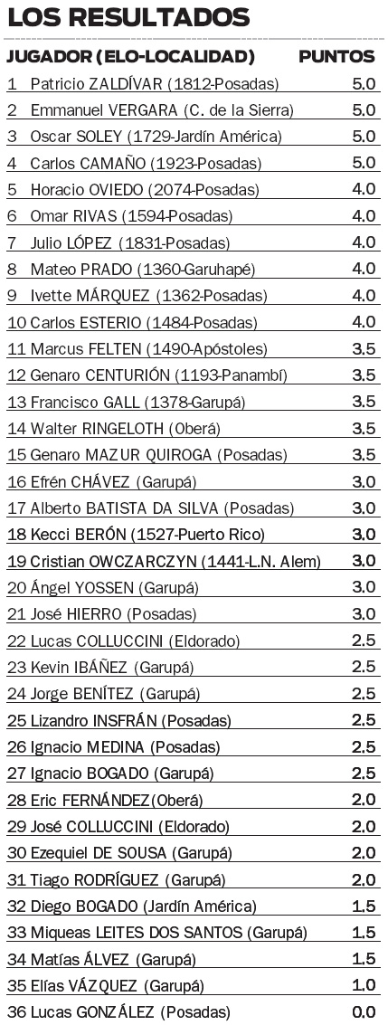 Así las cosas, tras una agotadora jornada en el predio de la calle Bernardo de Irigoyen, el posadeño Patricio Zaldívar se quedó con el triunfo al sumar cinco puntos y desempatar tras la igualdad que mantuvo con Emmanuel Vergara (Concepción de la Sierra), Oscar Soley (Jardín América) y Carlos Camaño (Posadas).