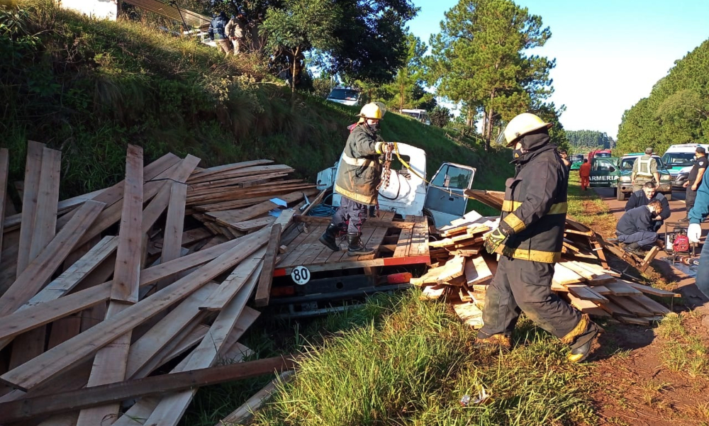 Un siniestro vial sobre la ruta nacional 14, en la localidad de Guaraní, dejó dos personas lesionadas tras el despiste de un camión que transportaba tablas de madera.