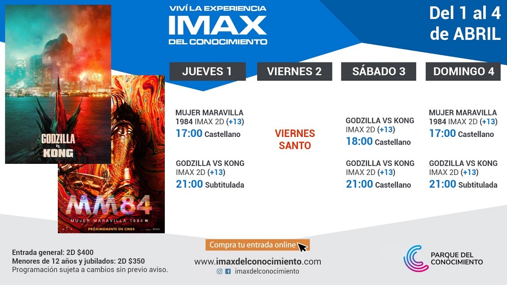 Desde el jueves y hasta el domingo, el IMAX del Parque del Conocimiento, de la capital provincial, preparó un combo para toda la familia con dos films de los más taquilleros: La Mujer Maravilla y Godzilla vs. Kong. Ya están disponibles las entradas en la web agendadelconocimiento.com.ar o la app para celulares del IMAX.
