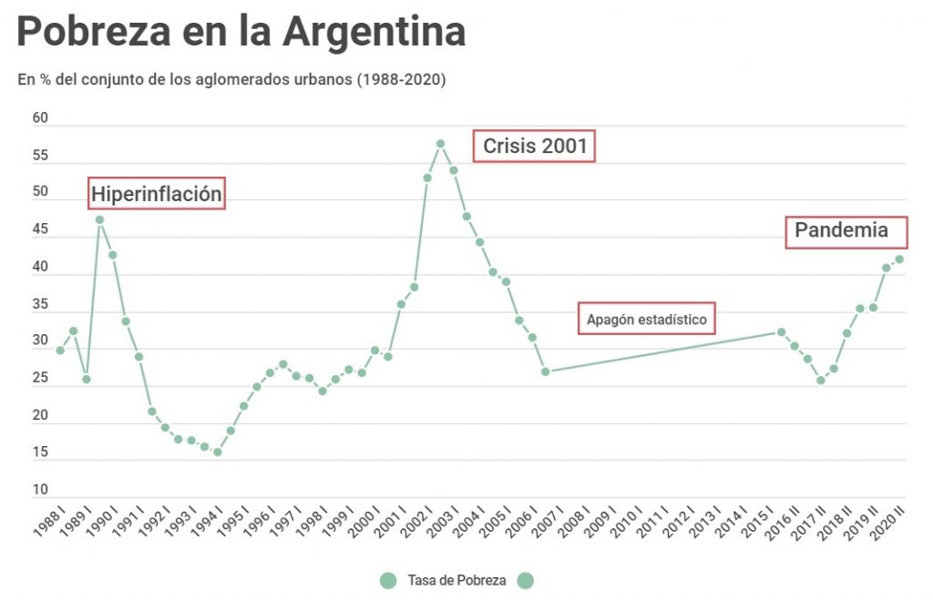 De acuerdo con los resultados de la Encuesta Permanente de Hogares (EPH) publicada ayer, en el último semestre de 2020 la pobreza aumentó y alcanzó al 42% de la población, lo que significa que casi 19 millones de personas no contaron con los ingresos necesarios para cubrir la canasta básica de consumo.