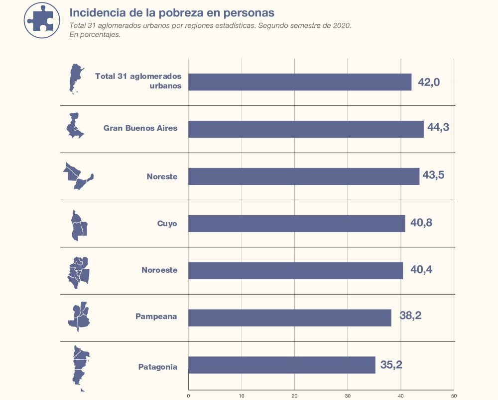 Ambos indicadores crecieron en comparación con el mismo semestre de 2019 (6,5 y 2,5 puntos porcentuales, respectivamente) y, en el caso de la pobreza, también contra el último dato de pobreza que había arrojado el Instituto Nacional de Estadística y Censos (INDEC), correspondiente al primer trimestre de 2020. En ese entonces, el organismo estadístico había informado una pobreza del 40,9% que, proyectado a la población total, significaba que 18,4 millones de personas se encontraban por debajo del umbral de pobreza.