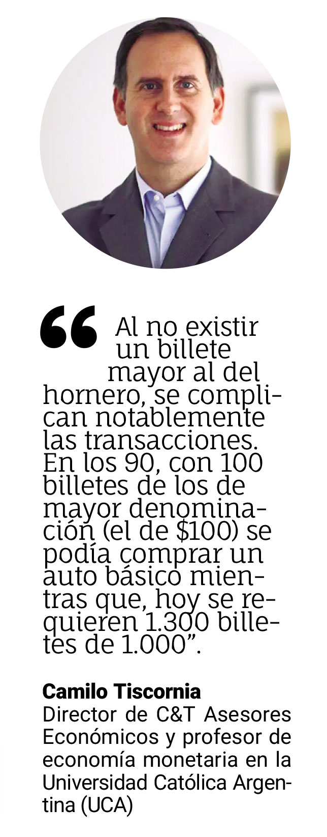“Los 100 pesos que se emitieron durante la convertibilidad equivalen hoy a 14.300 pesos, si se usa como referencia el blue. O sea, billetes de 10.000 pesos parecen muy necesarios, y de ahí para abajo”, sentencia a iProfesional.