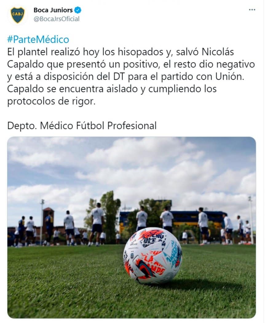 En las últimas horas, Boca Juniors comunicó oficialmente a toda su afición que presentó un caso positivo a la COVID-19. Se trata de Nicolás Capaldo y no estará presente en el cotejo ante Unión.